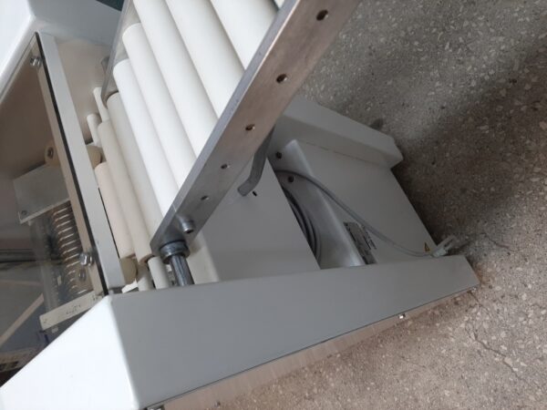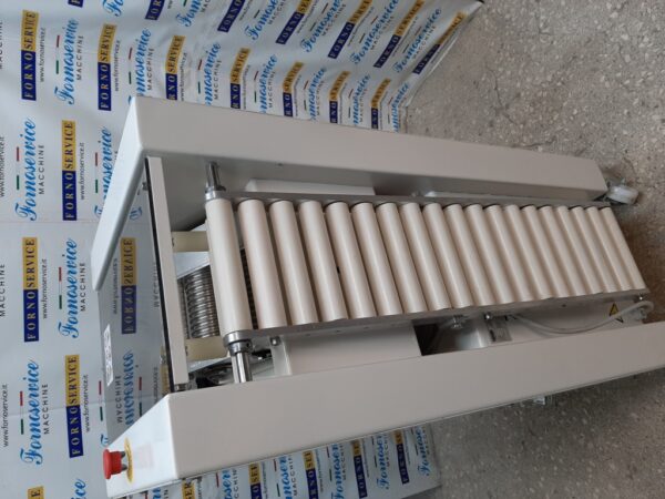 Una volta avviata la macchina una lama taglia il prodotto nella lunghezza che si desidera, facilmente impostabile dal pannello comando. Quando la Grissinatrice non viene utilizzata è possibile richiudere la rulliera di alimentazione e il nastro di scarico per limitarne l’ingombro.