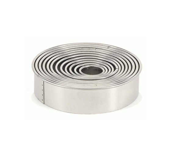 Set di 14 tagliapasta di diverso diametro a cerchio liscio, in acciaio.